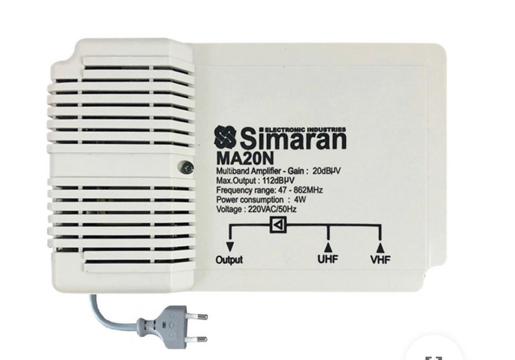 امپلی فایر انتن مرکزی سیماران ma20n: تقویت کننده چند ورودی MA20/N سیماران با گین 20 دسی بل و با قابی از جنس پلاستیک می باشد. این آمپلی فایر سیماران برای ساختمان هایی با تعداد حداکثر 8 واحد مناسب است. تقویت کننده انتن سیماران مدل ma20 دارای دو خروجی بوده و قابلیت اتصال به سیستم دوربین مداربسته را نیز دارا می باشد. گارانتی آنتن مرکزی سیماران 24 ماه می باشد.