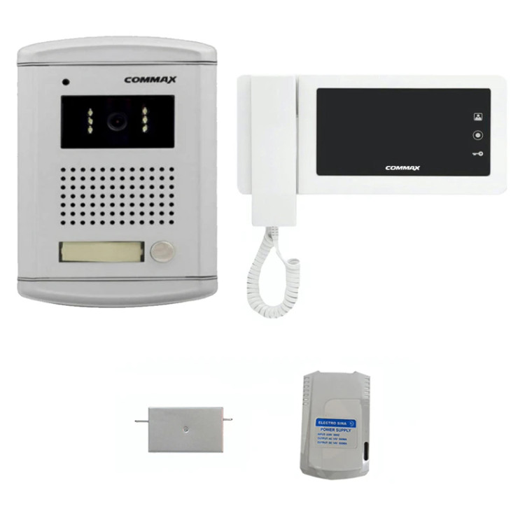 محصول ایفون تصویری کوماکس معرفی شده شامل ؛ یک عدد مانیتور ۴.۳اینچ دکمه لمسی ، یک عدد پنل ورودی تک واحدی ؛ یک جفت قفل و ترانس درب بازکن زنجیری میباشد