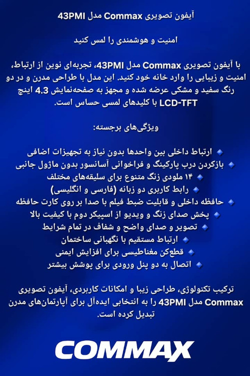 آیفون تصویری کوماکس معرفی شده با مانیتور جدید کوماکس میباشد که قابلیت ضبط تصویر مراجعه کننده / ارتباط داخلی بین طبقات / ۱۴ ملودی زنگ متنوع / منوی بازکردن درب پارکینگ / منوی انگلیسی و فارسی / تصویر شفاف و واضح / پشتیبانی از دو درب ورودی را را دارد.