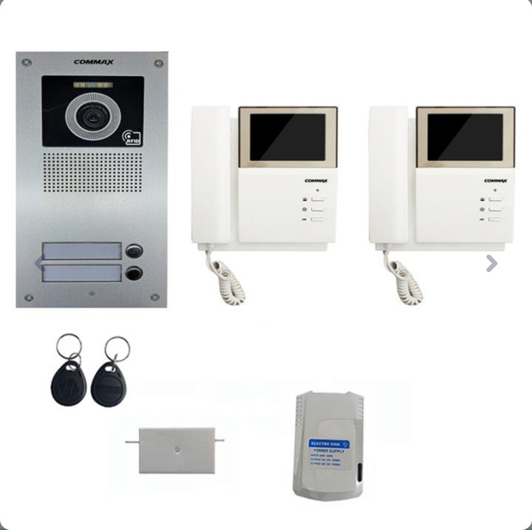 پک کامل آماده به نصب آیفون تصویری کوماکس با پنل کارتی(تگ خور) که شامل 2 عدد مانیتور 4.3 اینچ+ یک عدد پنل 2 شاسی ورودی با 2 عدد تگ اضافی+ قفل و ترانس درب بازکن زنجیری